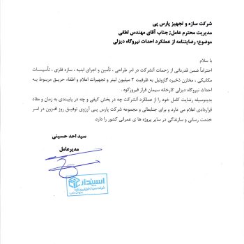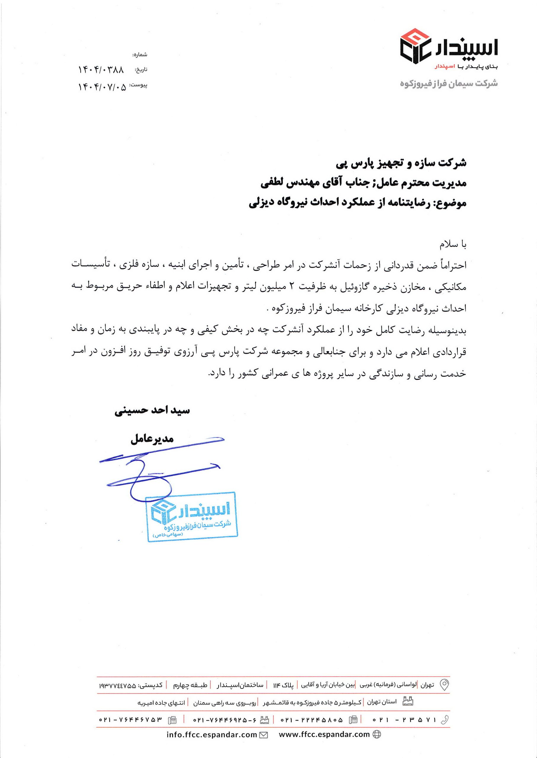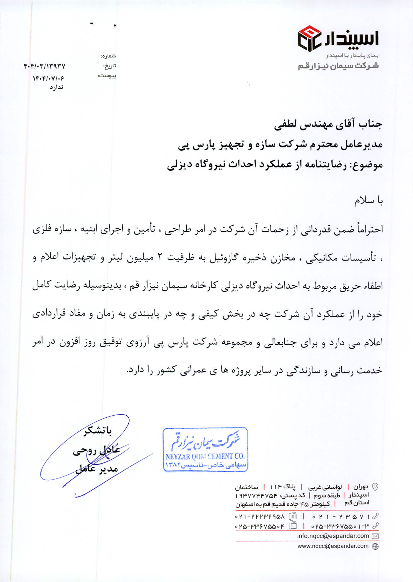 مفتخریم که شرکت سازه و تجهیز پارس پی توانسته است رضایت شما کارفرمایان محترم را کسب نماید.